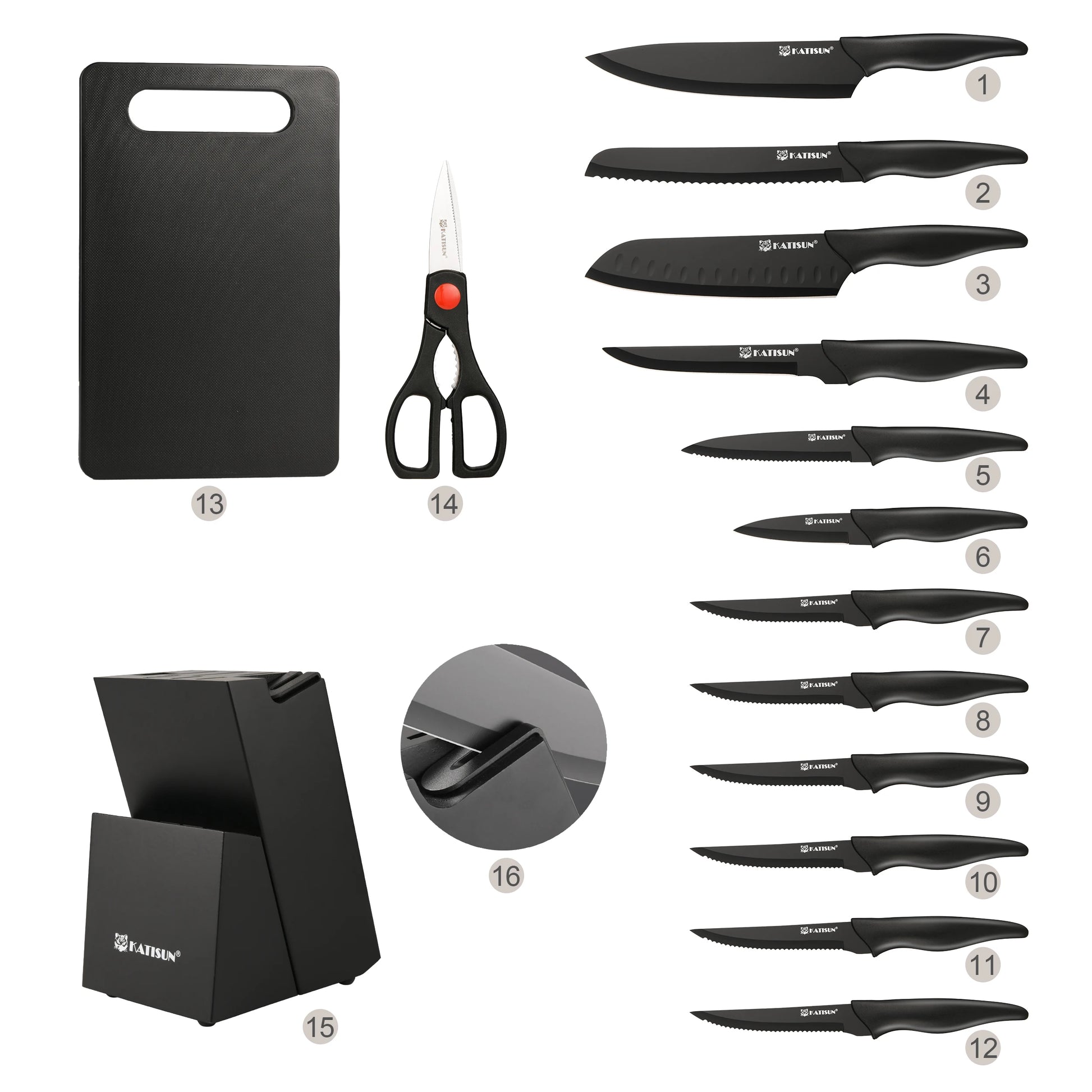 - This 16-piece set gives you a full range of essential knives, plus a built-in block and cutting board for safe, space-saving storage and prep.