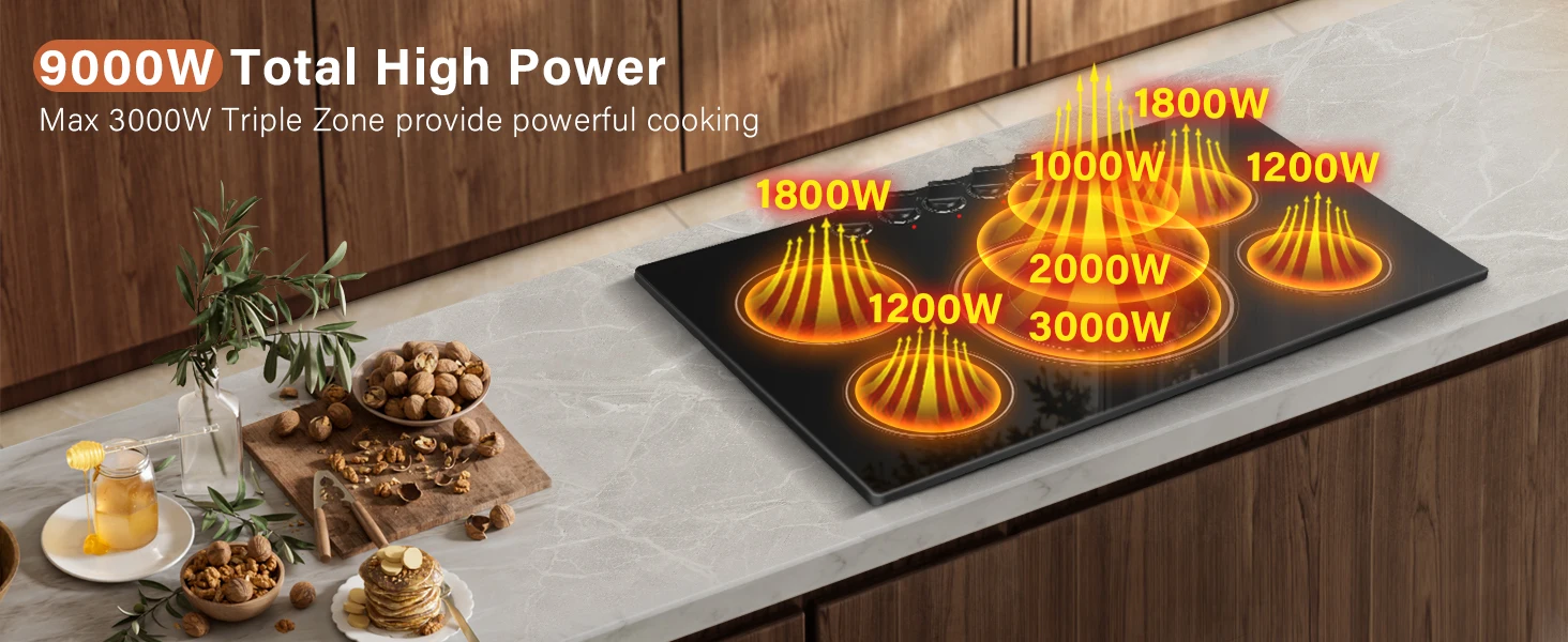 Experience rapid 3000W central burner performance with our electric cooktop 30 inch,boiling 6L water in 8 minutes-5 mins faster than coil stoves. Five-burner system delivers 9 precision heat levels(simmer 500W to sear 3000W),ideal for multi-tasking:slow-cook stews (Left 1200W)while stir-frying (Center 3000W)and simmering sauces (Right 1800W).