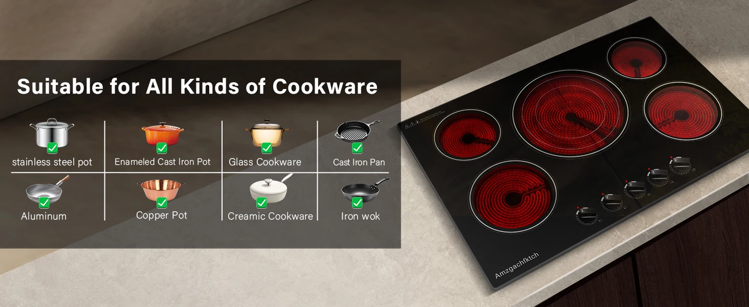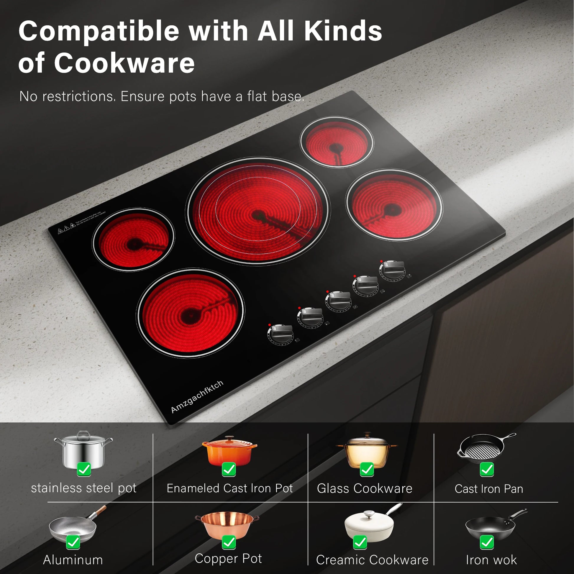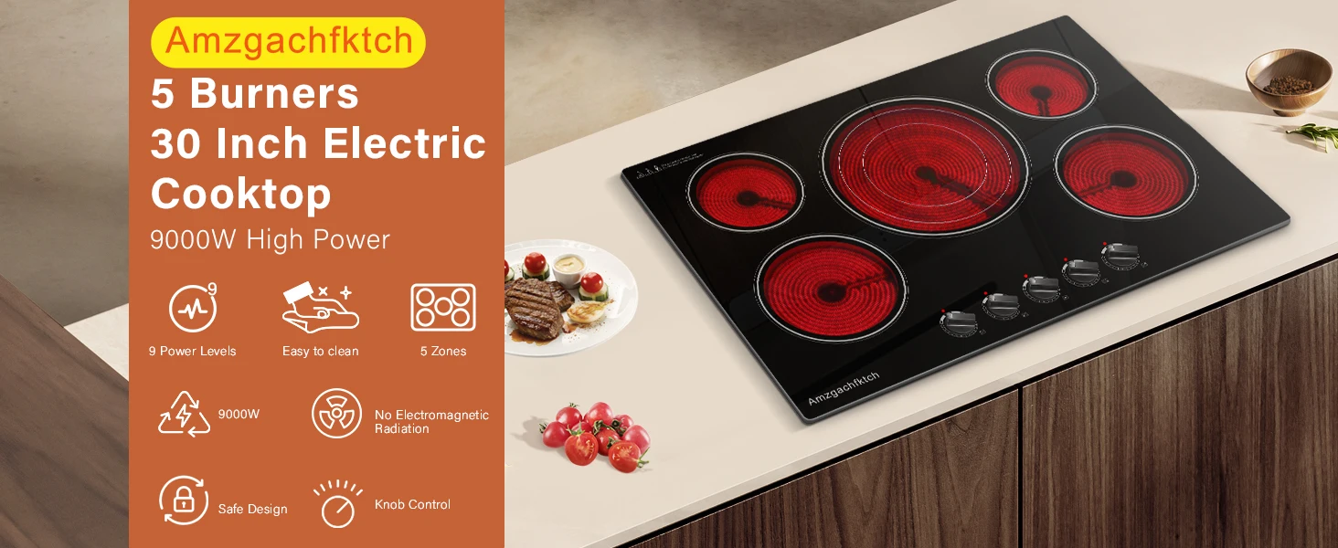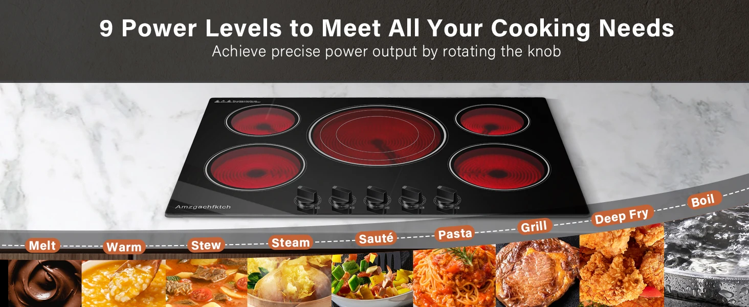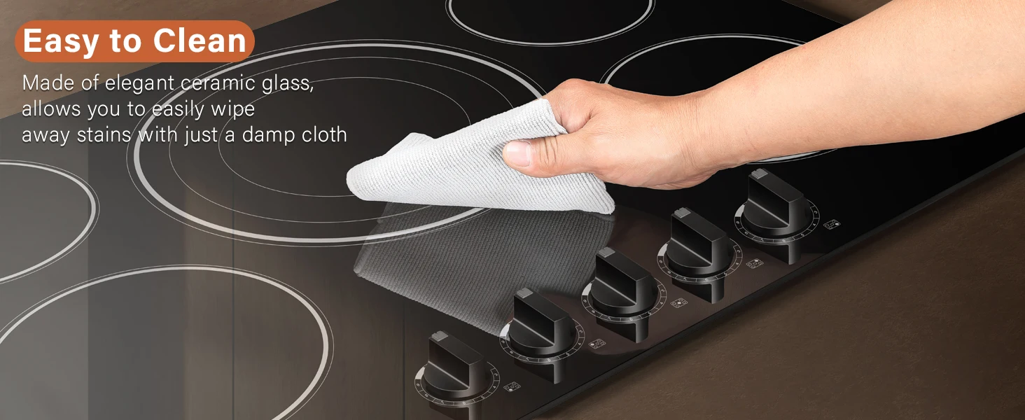 Enjoy worry-free cooking with our 30"electric stovetop featuring triple safety:hot surface indicators,auto shut-off,and electromagnetic radiation-free ceramic surface.Specifically designed for households with infants/pregnant members.The 5-burner electric cooktop offers 9 precision heat levels through intuitive knob controls-ideal for seniors and those preferring straightforward operation.No complicated settings,just pure cooking ease.