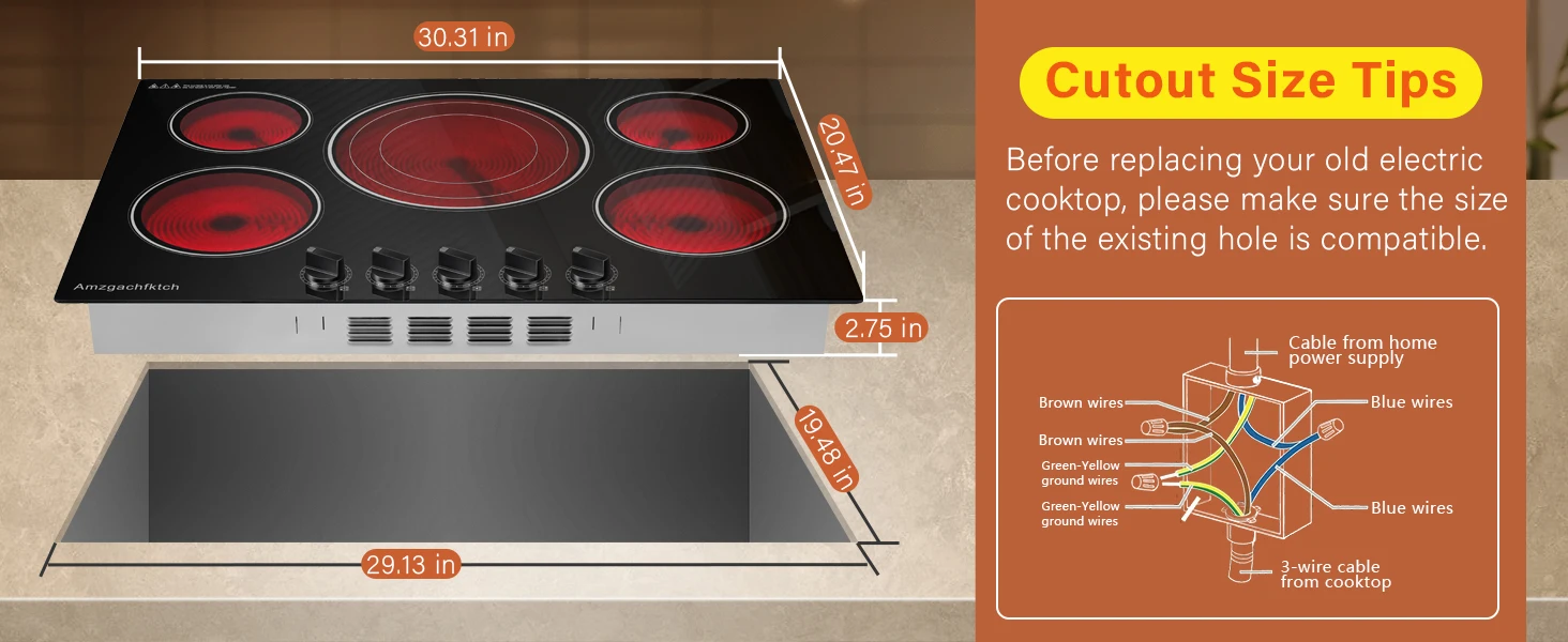 Upgrade your kitchen with this 30-inch built-in cooktop,designed to save space by concealing the base and wires beneath your countertop.The stove top's sleek glass surface sits flush for a seamless fit,blending into modern kitchens while freeing up workspace.Its black glass panel elevates your kitchen's style,creating an efficient cooking hub.Note: Confirm cut-out dimensions before purchase:Stove top Size:30.31 in x 20.47 in x 2.75 in,Cut-out Size:29.13 in x 19.48 in.